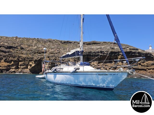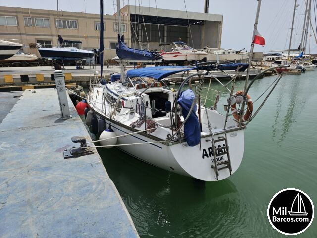 | Equipamiento, extras, documentación: | Características generales Eslora total: 9,43 m Eslora de flotación: 7,00 m Manga máxima: 3,25 m Calado: 1,78 m Puntal: 1,56 m Desplazamiento: 4.200 kg Lastre en orza: 1.650 kg (39,3%) Guinda (sin antena VHF): 13,10 m Depósito de gasoil inox: 50 L Depósito de agua flexible: 100 L Construcción Casco en PRFV contramoldeado interiormente Cubierta sandwich poliéster/balsa contramoldeada Casco y cubierta pintados con pintura 2C en 2021 Metacrilatos nuevos 2023 Seguridad Material de seguridad en vigor para 6 personas, zona 4 Radiobaliza y balsa 2021 (pendientes de revisión) Electrónica y electricidad Red NMEA 0183 cableada e inalámbrica Piloto de caña Raymarine ST2000 con mando Equipo de viento, corredera y sonda NASA Marine GPS Garmin AIS B Camino 108 NAVTEX NASA Marine Radar JRC 100 VHF Navicom RT-550 DSC Baterías AGM servicios 230Ah + 100Ah Batería arranque 100Ah gel Paneles solares en bimini 520W Regulador solar MPPT dual 40A Separador baterías Victron Bluetooth Cargador inteligente Victron 20A Monitorización digital de baterías Tomas 12V y USB TV 27” en salón Bomba de agua a presión Calefacción estacionaria (tipo Webasto) Bomba de sentina automática Fondeo Molinete eléctrico Lofrans 1000W Mando en proa y mando a distancia Ancla Bruce 10 kg 70 m de cadena 8 mm Rezón plegable 12 kg Estachas varias (≈100 m) 9 defensas Jarcia y velas Tangón de aluminio en cubierta Mayor Dacron 2023 Génova 150% con banda solar, 2023 Spinnaker Enrollador Furlex MKII Winches Lewmar: 2 × ST40 2 × ST8 1 en palo 1 en botavara Confort Bimini y antirrociones Toldo de fondeo Ducha en bañera Cocina basculante 2 fuegos Nevera 12V Iluminación LED WC marino manual Jabsco Tapicería exterior nueva 2024 Escalera de baño en popa |
