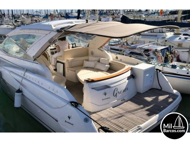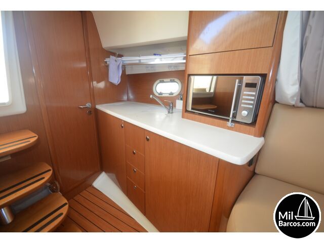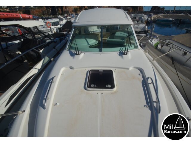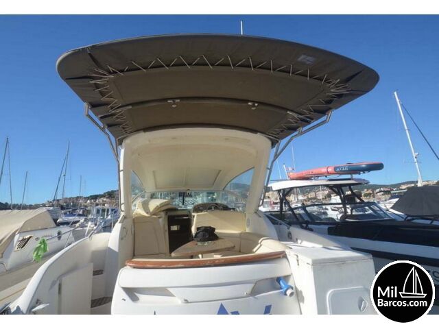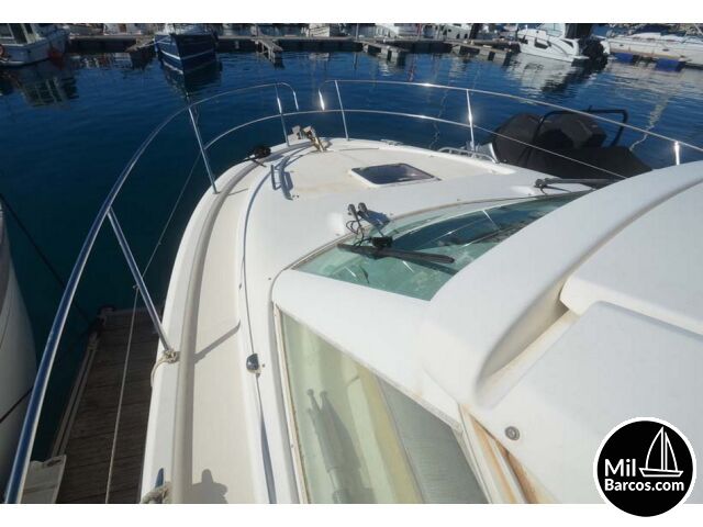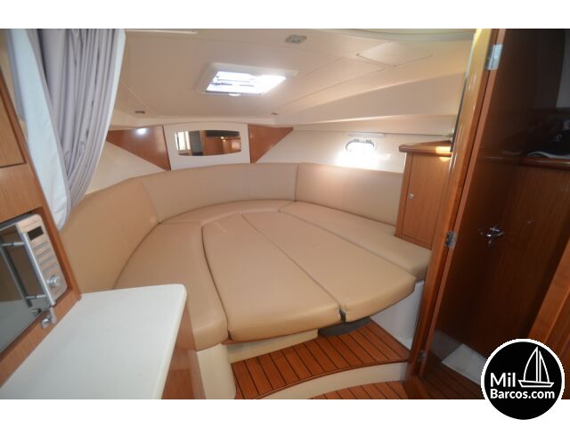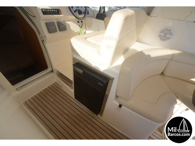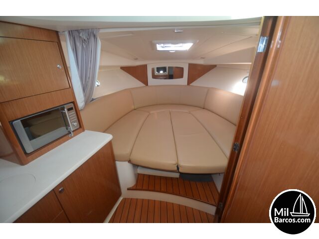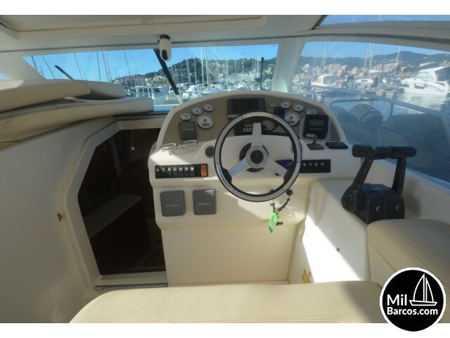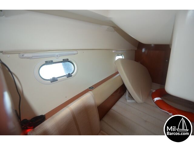 Jeanneau Prestige 30 S, motores 2 x 190 Hp. Volvo turbo Diesel, apto para 8 pasajeros, año 2007, hélice de proa, piloto automático, agua caliente, 2 camarotes dobles, GPS Garmín, Sonda, VHF homologada, doble hélice por motor, Molinete eléctrico, Hard Top con techo abatible, toldo de sol en bañera, radio musical, plataforma, ducha, cuarto de aseo, microondas, doble parabrisas, solárium a proa con colchonetas, amplio sofá con mesa en bañera, 2 neveras eléctricas, escotilla de ventilación sobre cabina, cargador de baterías, toma a puerto de 220 V.