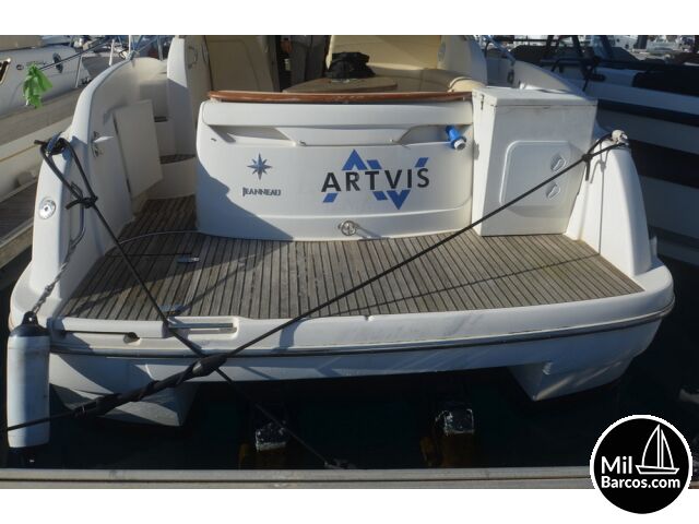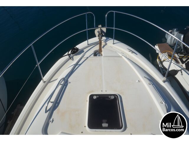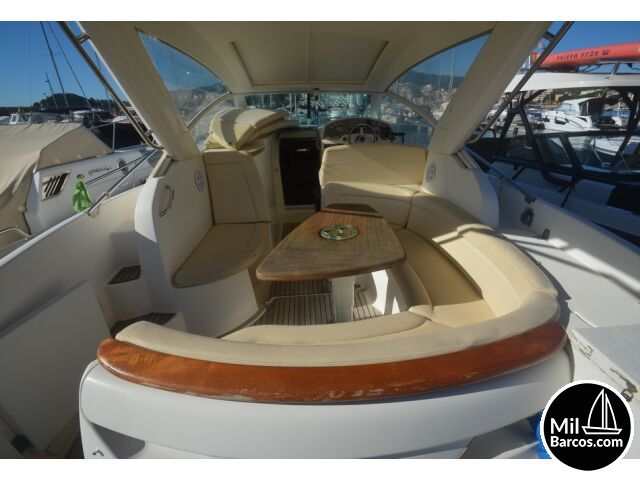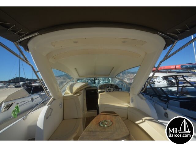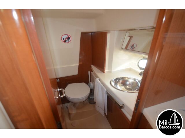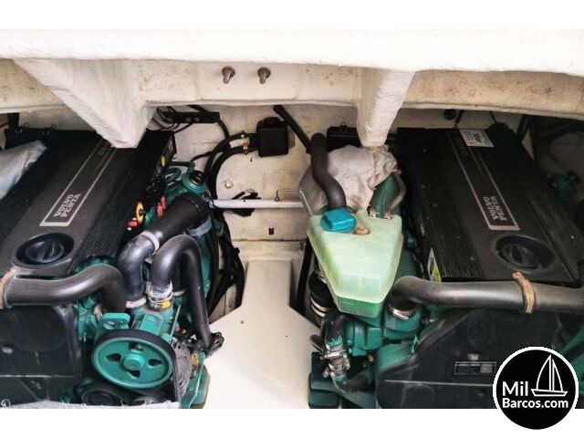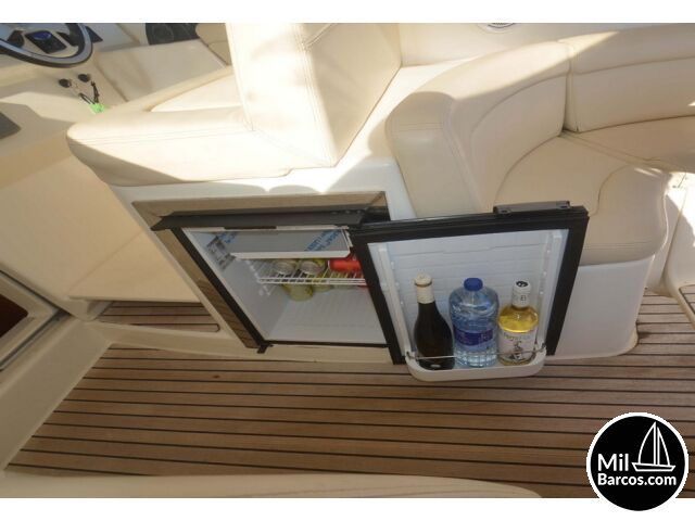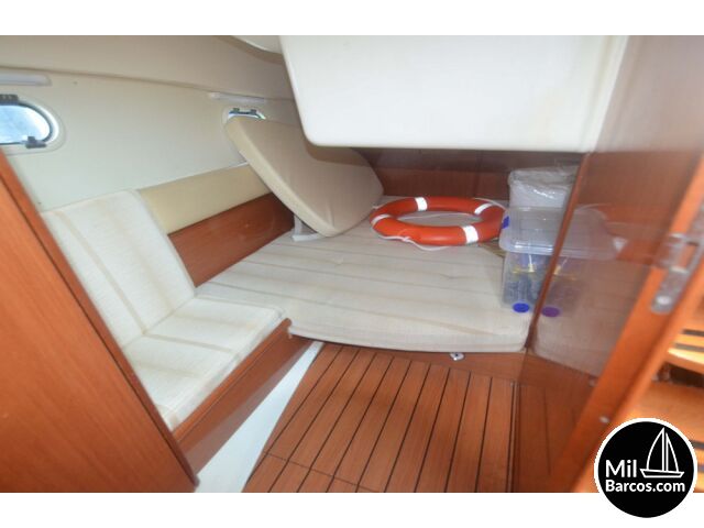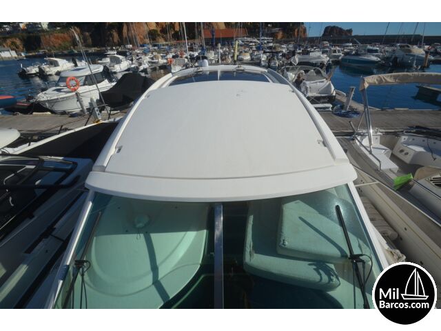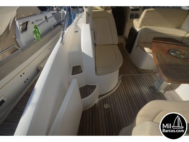 Jeanneau Prestige 30 S, motores 2 x 190 Hp. Volvo turbo Diesel, apto para 8 pasajeros, año 2007, hélice de proa, piloto automático, agua caliente, 2 camarotes dobles, GPS Garmín, Sonda, VHF homologada, doble hélice por motor, Molinete eléctrico, Hard Top con techo abatible, toldo de sol en bañera, radio musical, plataforma, ducha, cuarto de aseo, microondas, doble parabrisas, solárium a proa con colchonetas, amplio sofá con mesa en bañera, 2 neveras eléctricas, escotilla de ventilación sobre cabina, cargador de baterías, toma a puerto de 220 V.