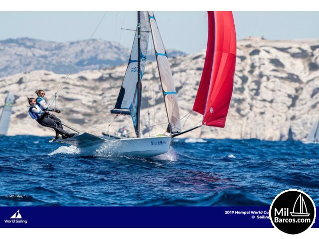 | Équipement, extras, documentation: | 2 juegos de vela para entrenar + una mayor nueva sin uso Maniobras completas + repuestos 1 mástil completo + 1 sin tope Prolongadores full carbono |